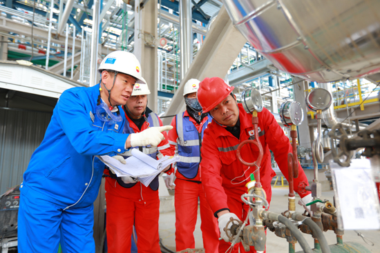 图为项目MTBE/丁烯-1装置负责人王开发(左一)与施工方人员一起对装置进行试压前的检查。